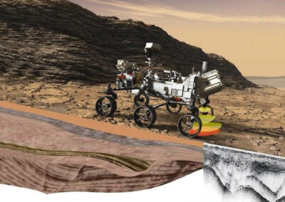 As Perseverance transits across its area of study the RIMFAX antenna transmits frequencies from 150 – 1200 MHz into the ground and then detects the resulting reflected signals that return to the system, providing centimeter-scale resolution of the geologic structure at depths of more than 10 meters (30 feet) below the rover, allowing scientists to search for evidence of past life hidden below the planet’s surface.